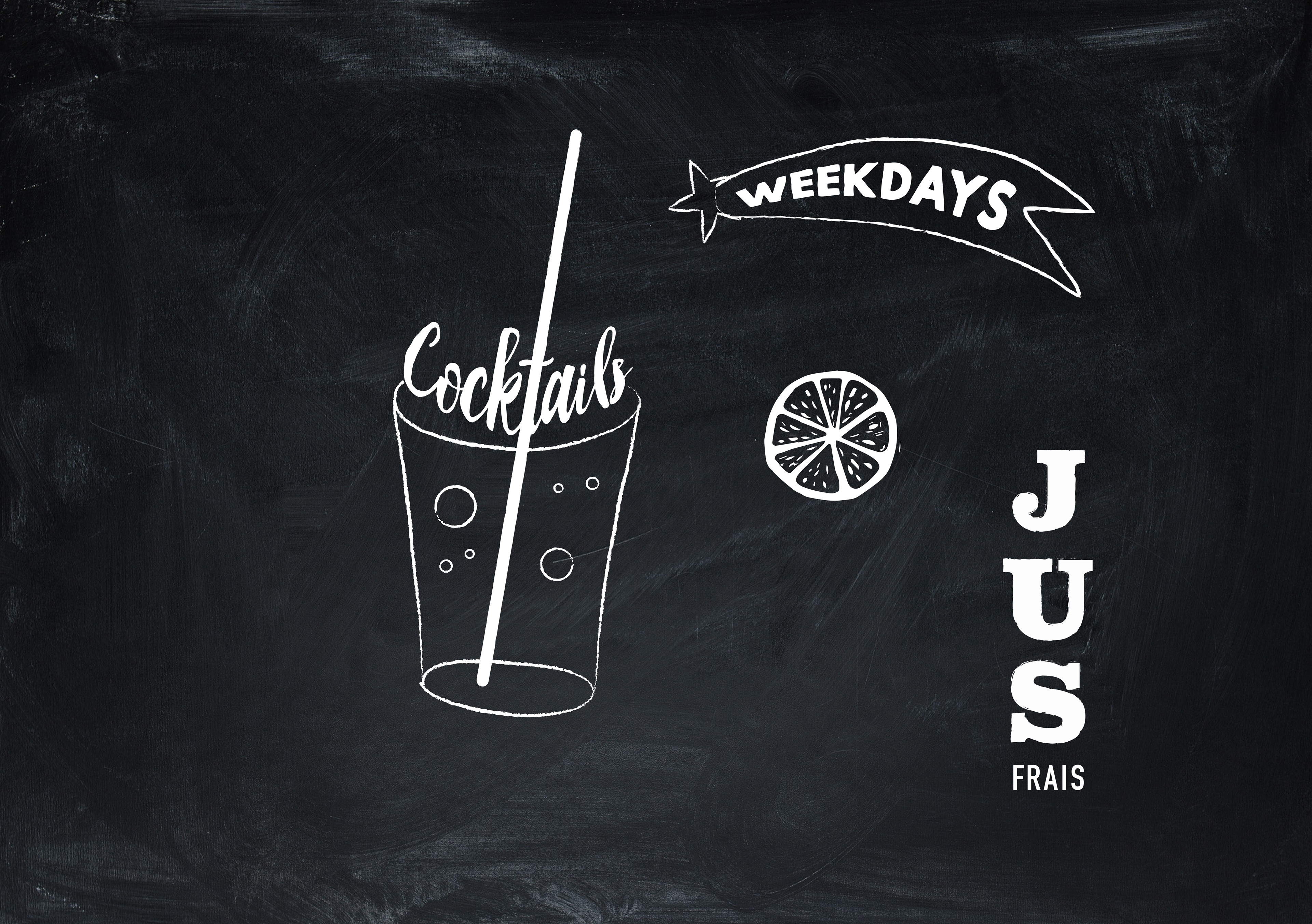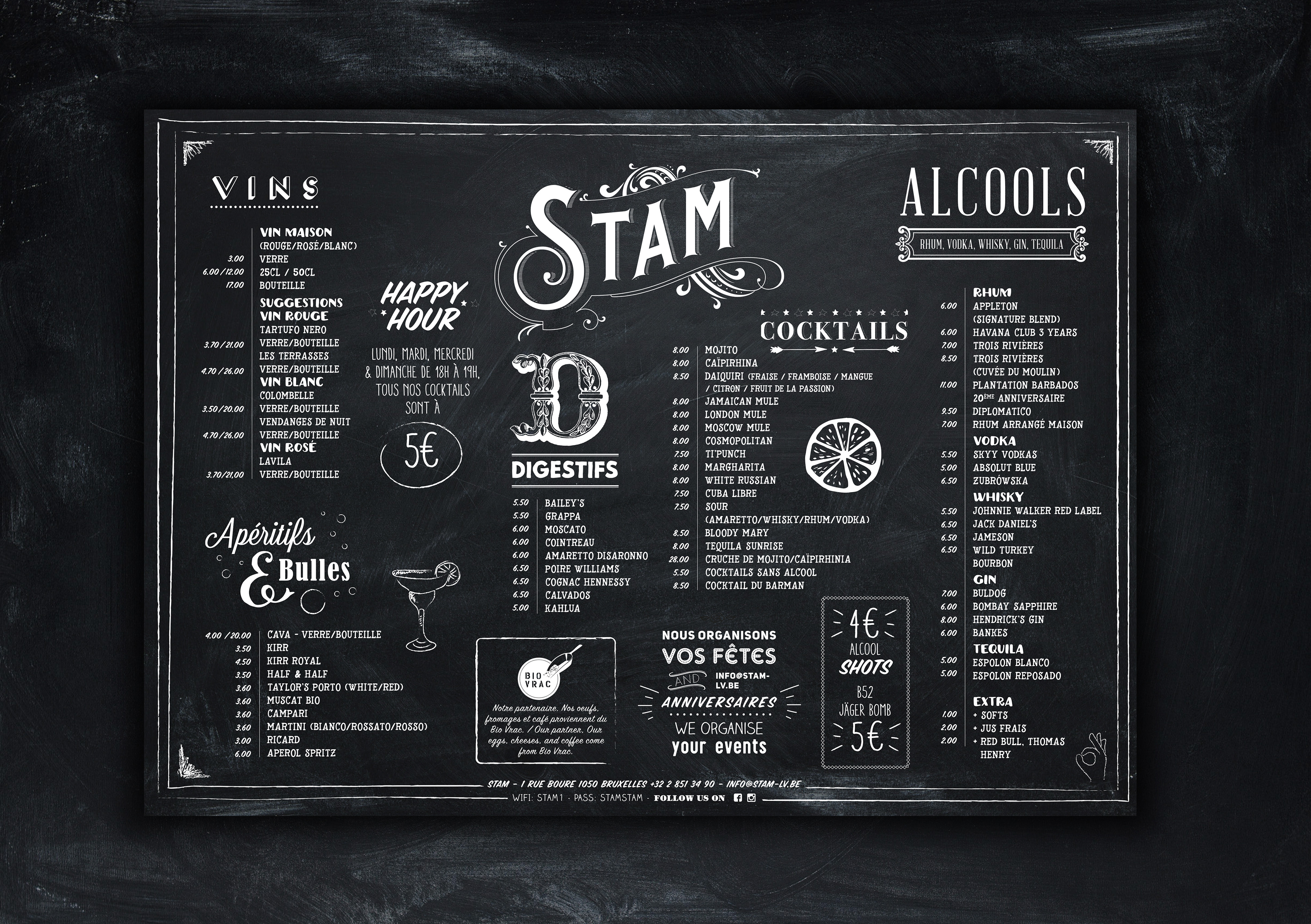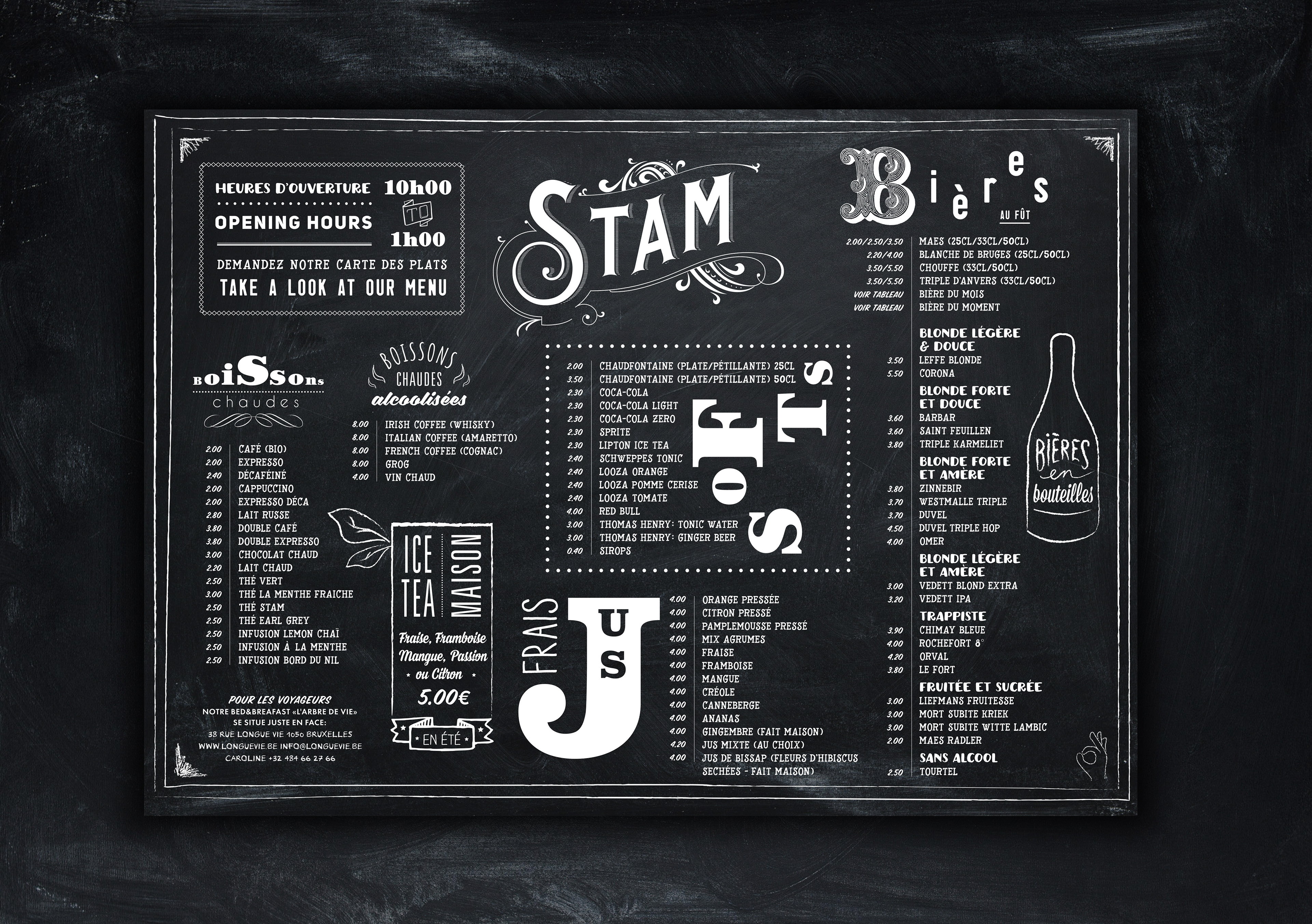 Designing the menu's Stam Café in Ixelles, Brussels. Layout, illustrations, typography. 420x297mm, 350gr.